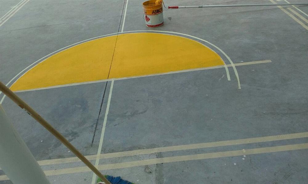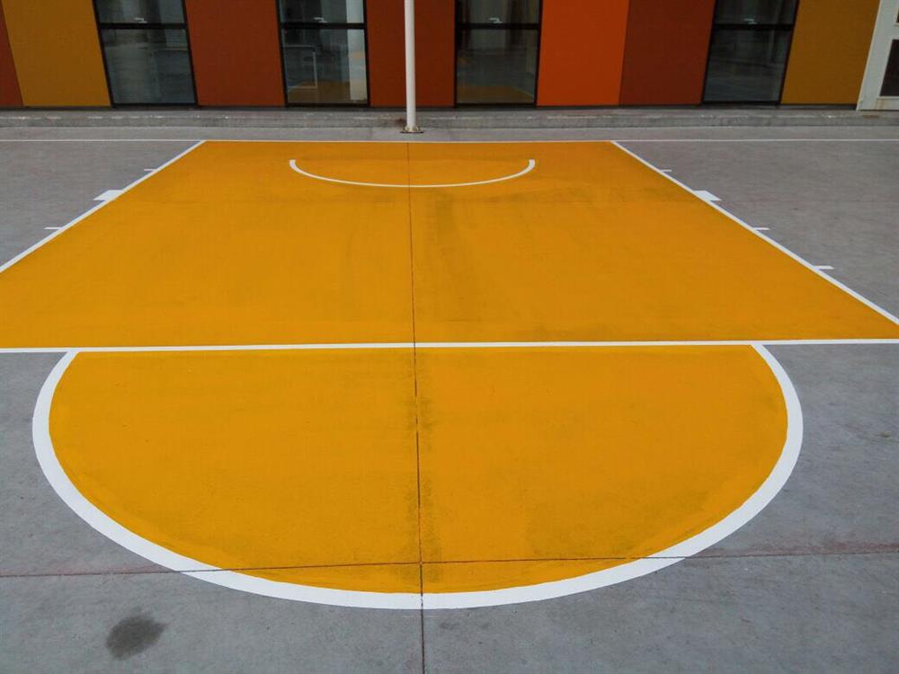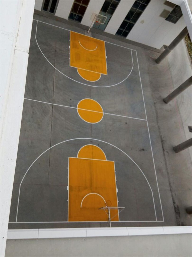 Standart akrilik basketbol saha zemin kaplamasının maliyetinin yüksek kaldığı projelerde zaman zaman uyguladığımız üzere; sadece saha çizgilerinin çizilmesi ve üç saniye ile orta yuvarlak alanlarının boyanması işlemi, oldukça hızlı ve ekonomik bir çözüm olmaktadır.